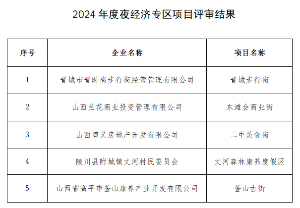 根据《晋城市人民政府办公室关于印发晋城市发展夜间经济促进消费升级的实施意见的通知》(晋市政办〔2020〕49号)和《晋城市商务局关于2024年度夜经济专区项目申报的通知》(晋市商市函〔2025〕120号)的相关规定要求,市商务局组织对2024年度夜经济专区项目进行了征集,经企业申报、县级商务主管部门初审,申报项目共计5个。经2025年12月21日评审组评审,符合夜经济专区认定条件且通过评审的项目共计5个,现将评审结果公示如下: